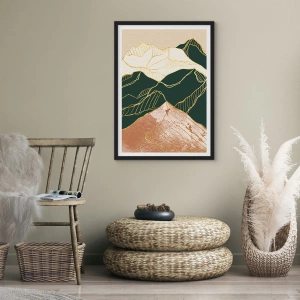 „Złote szczyty” to elegancki plakat, który łączy w sobie elementy abstrakcji i naturalnego pejzażu. Przedstawia stylizowane góry wyrysowane złotymi liniami, które nadają kompozycji wyjątkowej elegancji i harmonii. Kolorystyka utrzymana w głębokiej zieleni, ciepłym brązie i delikatnym beżu tworzy spójną, spokojną całość.