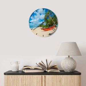 Zegar ścienny - Urok tropików - Plaża z palmami i czerwonym łodzią na tle błękitnego nieba