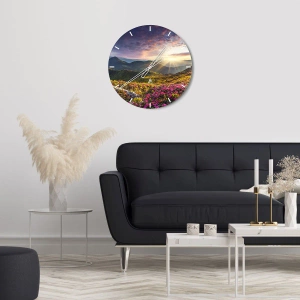Zegar ścienny - Świeżość górskiego poranka - Malowniczy widok gór z kwitnącymi różowymi kwiatami o wschodzie słońca