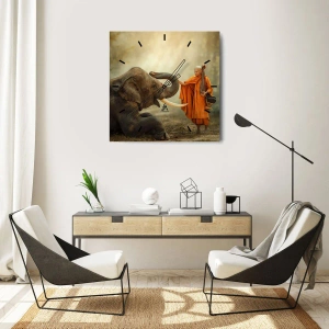 Zegar ścienny - Mnich buddyjski i słoń w spokojnym, naturalnym otoczeniu - 30x30cm - Spotkanie w podróży - Nowoczesna dekoracja ścienna do salonu, kuchni i sypialni ARTTOR