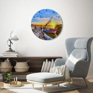 Zegar ścienny - Łódka przy drewnianym pomoście o zachodzie słońca - 30x30cm - Do widzenia, do jutra - Nowoczesna dekoracja ścienna do salonu i sypialni ARTTOR