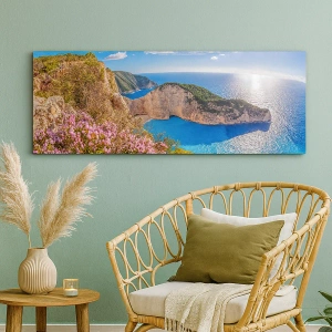 - Grecki krajobraz z malowniczym klifem, turkusowym morzem i jasnym słońcem, otoczony delikatnymi kwiatami. Obraz emanuje harmonią i pięknem natury, doskonale wpisując się w aranżacje wnętrz inspirowane śródziemnomorskim stylem.