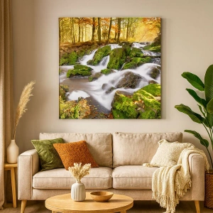Obraz na płótnie - Zalesiony krajobraz z wodospadem otoczonym mchem - 70x100cm - Bystro przez jesienny las - Nowoczesna dekoracja ścienna do salonu i sypialni ARTTOR