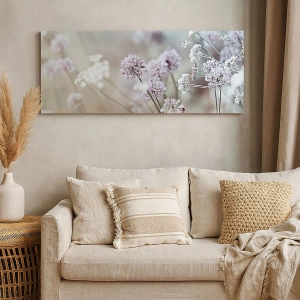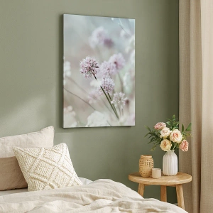 Obraz na płótnie - Delikatne różowe kwiaty w pastelowej, rozmytej scenerii - 50x70cm - Słodkie filigrany ziół - Nowoczesna dekoracja ścienna do salonu, kuchni i sypialni ARTTOR