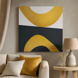 "Po pierwsze: złoto" to obraz, który przyciąga uwagę prostotą i elegancją geometrycznych form. Złote kształty kontrastują z białym i ciemnym tłem, tworząc wyrazistą, nowoczesną kompozycję. Dzięki minimalizmowi i harmonii form, dzieło to doskonale pasuje do współczesnych przestrzeni mieszkalnych i komercyjnych.
