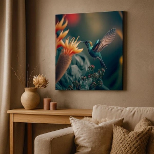 Obraz na płótnie - Kolorowy koliber unoszący się przy kwiatach w tropikalnym otoczeniu - 50x70cm - naprawdę barwne życie - Nowoczesna dekoracja ścienna do salonu, kuchni i sypialni ARTTOR