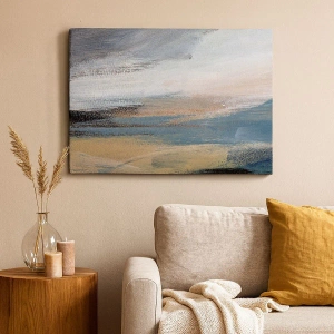 - Obraz na płótnie 70x50 cm przedstawiający abstrakcyjny pejzaż w stonowanych odcieniach błękitu i beżu. Idealny do wnętrz ceniących spokój i harmonię, nadając im artystycznego wyrazu.