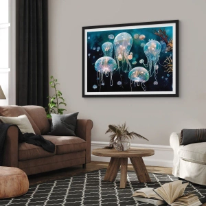 Plakat w czarnej ramie - Subtelne meduzy unoszące się w morskiej toni - 50x70cm - Podwodny bal - Nowoczesna dekoracja ścienna do salonu i sypialni ARTTOR