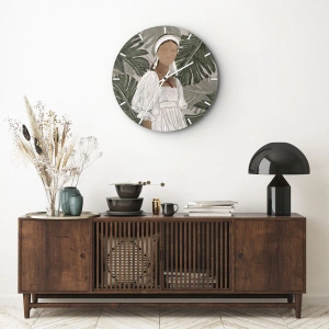 Zegar ścienny - Portret egzotyczny - Stylizowany portret kobiety na tle liści tropikalnych