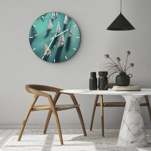 Zegar ścienny ""W zawody z wiatrem"" to kwintesencja letniego klimatu i wolności, jaką daje żeglarstwo. Przedstawia flotę jachtów żaglowych, sunących po morzu w zgranym, dynamicznym szyku. Ujęcie z lotu ptaka oddaje zarówno ruch, jak i lekkość, jaką niesie wiatr w żaglach – tworząc niesamowity, pełen energii krajobraz.