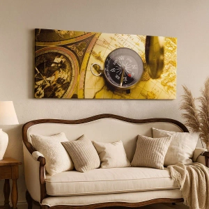 - Obraz ukazuje zabytkowy kompas umieszczony na tle starej mapy świata. Styl vintage oraz ciepłe barwy nadają elegancji, tworząc idealną dekorację do gabinetów, biur oraz wnętrz inspirowanych podróżami.