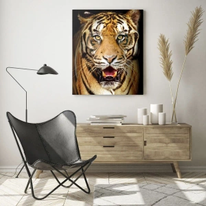Obraz na szkle - Tygrys na ciemnym tle z intensywnym spojrzeniem - 50x70cm - Dzikość serca - Nowoczesna dekoracja ścienna do salonu, kuchni i sypialni ARTTOR