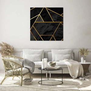 - Ekskluzywny obraz na szkle o czarno-złotej, geometrycznej kompozycji na marmurowym tle. Idealny do nowoczesnych i eleganckich wnętrz, takich jak salon, sypialnia czy biuro, wprowadzając luksus i harmonię.