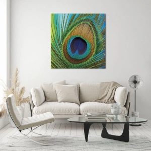 Obraz na szkle - Barwne pióro pawia w zbliżeniu - 50x70cm - Oko w oko - Nowoczesna dekoracja ścienna do salonu, kuchni i sypialni ARTTOR