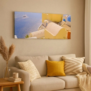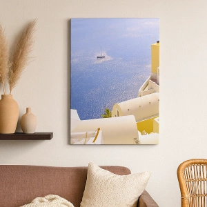 Obraz na płótnie - Grecka architektura z widokiem na morze i łódź w tle - 80x120cm - Grecki pejzaż w bieli i błękicie - Nowoczesna dekoracja ścienna do salonu i sypialni ARTTOR