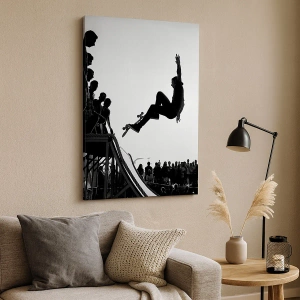 Obraz na płótnie - Czarno-biała sylwetka skatera w powietrzu - 50x70cm - Bohaterowie i widzowie - Nowoczesna dekoracja ścienna do salonu, kuchni i sypialni ARTTOR