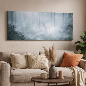 Obraz na płótnie - Jeleń w gęstej mgle leśnej - 50x70cm - Poranny obchód włości - Nowoczesna dekoracja ścienna do salonu, kuchni i sypialni ARTTOR