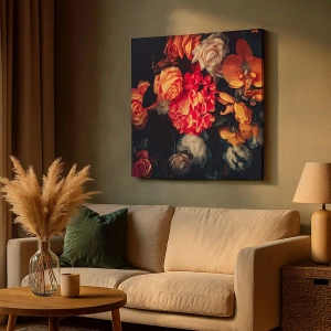 Obraz na płótnie - Bukiet kolorowych kwiatów na ciemnym tle - 50x70cm - Jak u holenderskich mistrzów - Nowoczesna dekoracja ścienna do salonu, kuchni i sypialni ARTTOR