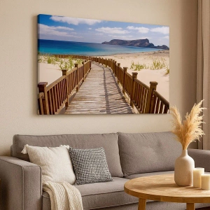 Zabierz mnie na wyspy szczęśliwe to obraz na płótnie, który przenosi nas w spokojny, nadmorski klimat. Drewniana ścieżka prowadzi przez piaszczystą plażę aż do turkusowego oceanu, który rozciąga się w tle pod błękitnym niebem z delikatnymi chmurami. Ten wyjątkowy widok odzwierciedla naturalne piękno i harmonię.