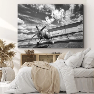Wymiary 70x50 cm sprawiają, że obraz doskonale wpasowuje się w różnorodne przestrzenie – może być centralnym punktem aranżacji lub subtelnym akcentem w większej kompozycji. Motyw samolotu i czarno-biała tonacja nadają mu uniwersalności i wyjątkowego charakteru.