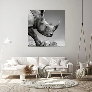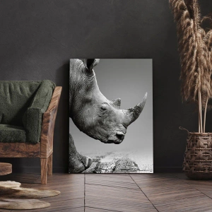- Monochromatyczny portret nosorożca uchwycony na tle szarej pustyni. Idealny do wnętrz o neutralnym charakterze, takich jak salon czy sypialnia. Wyrazista elegancja minimalizmu i afrykańskiej egzotyki.
