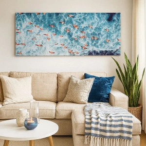Obraz na płótnie - Różowe flamingi nad błękitnym oceanem z lotu ptaka - 120x50cm - Nadmorska parada - Nowoczesna dekoracja ścienna do salonu i sypialni ARTTOR