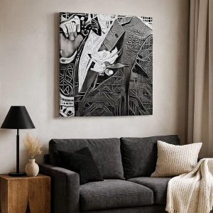 - Obraz przedstawia elegancką abstrakcję z mężczyzną w garniturze, utrzymaną w czarno-białej kolorystyce. Wyrazisty dodatek do klasycznych i nowoczesnych wnętrz.