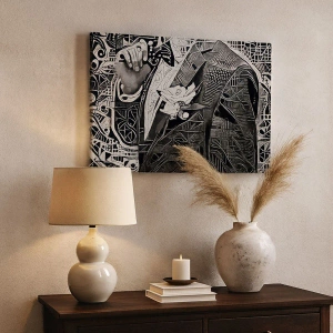 Detale wzorów i subtelne przejścia tonalne między czernią a bielą dodają głębi i wyrazistości. Ta unikalna kompozycja świetnie wpisuje się w nowoczesne i minimalistyczne wnętrza, podkreślając ich elegancki charakter. Jednocześnie, klasyczne motywy i retro styl czynią ten obraz wyjątkowym dodatkiem do bardziej tradycyjnych przestrzeni.