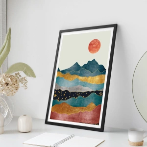 - Plakat przedstawia abstrakcyjne góry w odcieniach złota, błękitu i czerwieni, tworzące harmonijną kompozycję. Ciepła kolorystyka i geometryczna forma nadają mu elegancki wygląd.