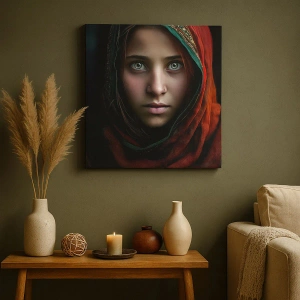 Obraz na płótnie - Portret kobiety o hipnotyzujących oczach w czerwonej chuście - 50x70cm - Wschodnia księżniczka - Nowoczesna dekoracja ścienna do salonu, kuchni i sypialni ARTTOR