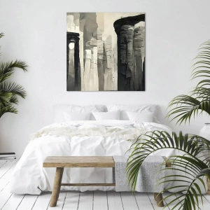 Kompozycja obrazu ukazuje majestatyczne kolumny, które symbolizują siłę, stabilność i ponadczasowość. Odcienie szarości i czerni podkreślają teksturę kamienia, nadając obrazowi głębi i wyrafinowania. Subtelne światło i cienie tworzą harmonijną atmosferę, która wprowadza spokój do każdego wnętrza.