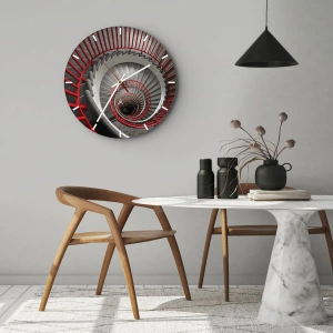 - Okrągły zegar ścienny o średnicy 30x30 cm z efektem spiralnych schodów widzianych z góry. Czerwone poręcze kontrastują z szarą przestrzenią, tworząc nowoczesną, dynamiczną kompozycję. Produkt marki ARTTOR.