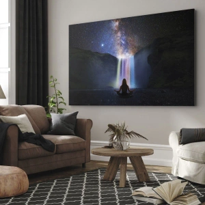 Obraz na płótnie - Medytacja przed wodospadem wśród gwiazd - 70x50cm - Absolutna harmonia - Nowoczesna dekoracja ścienna do salonu i sypialni ARTTOR