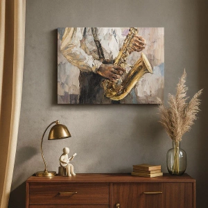 - Artystyczny obraz na płótnie o wymiarach 70x50 cm, przedstawiający muzykanta grającego na saksofonie. Idealny do wnętrz, wprowadzający pasję i elegancję.