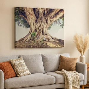 - Obraz przedstawiający tygrysa odpoczywającego pod rozłożystym drzewem. Egzotyczna dekoracja ścienna wprowadzająca harmonię i wyrazisty akcent natury do wnętrza.