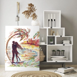 Obraz na szkle - Romantyczna scena pary na plaży z palmami w akwareli - 70x100cm - Romantyczne wakacje - Nowoczesna dekoracja ścienna do salonu i sypialni ARTTOR