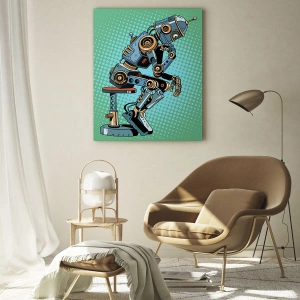 Obraz na szkle - Robot myśliciel na tle zielonego pop-artowego wzoru - 50x70cm - Nad istotą bytu - Nowoczesna dekoracja ścienna do salonu, kuchni i sypialni ARTTOR