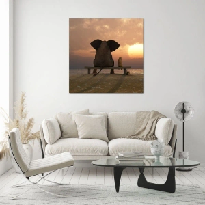 Obraz na szkle - Słoń i pies na ławce przy zachodzie słońca - 50x70cm - Dobrze jest razem pomilczeć - Nowoczesna dekoracja ścienna do salonu, kuchni i sypialni ARTTOR