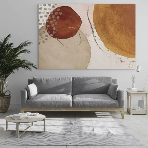 - Obraz ukazuje abstrakcyjne okręgi w odcieniach beżu, brązu i złota, tworzące harmonijną i elegancką kompozycję. Zastosowana kolorystyka i miękkie kształty nadają całości ciepły i nowoczesny charakter.