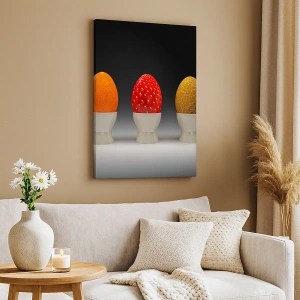 Obraz na płótnie - Kolorowe jajka w kieliszkach na ciemnym tle - 50x70cm - Owocowe śniadanie - Nowoczesna dekoracja ścienna do salonu, kuchni i sypialni ARTTOR