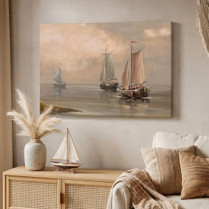 Obraz na płótnie - Żaglówki na spokojnym morzu w pastelowych tonacjach - 50x70cm - Powrót żeglarzy - Nowoczesna dekoracja ścienna do salonu, kuchni i sypialni ARTTOR