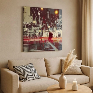 Obraz na płótnie - Miasto nocą z neonami i sylwetkami ludzi na ulicy - 70x100cm - Wielkomiejska przeprawa - Nowoczesna dekoracja ścienna do salonu i sypialni ARTTOR
