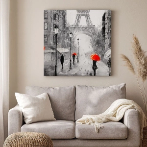 Obraz na płótnie - Monochromatyczna ulica Paryża z Wieżą Eiffla i czerwonymi parasolami - 50x70cm - Wszystkie drogi prowadzą do niej - Nowoczesna dekoracja ścienna do salonu, kuchni i sypialni ARTTOR