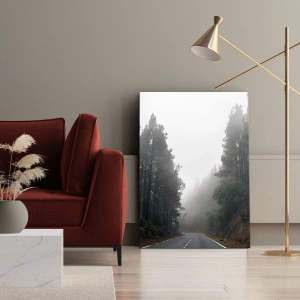 Obraz na płótnie - Droga prowadząca przez mglisty las sosnowy - 50x70cm - Opowieść magicznego lasu - Nowoczesna dekoracja ścienna do salonu, kuchni i sypialni ARTTOR