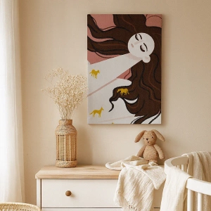 - Obraz przedstawia postać o zamkniętych oczach otoczoną złotymi końmi, spoczywającą na jasnym tle, w otoczeniu delikatnych brązowych włosów. Całość ma wyraz współczesnej sztuki, która oddaje harmonię i subtelność naturalnych motywów.
