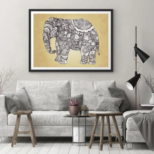 Plakat w czarnej ramie - Ręcznie rysowany słoń z ozdobnym wzorem na beżowym tle - 70x50cm - Słoń się zasłonił - Nowoczesna dekoracja ścienna do salonu i sypialni ARTTOR