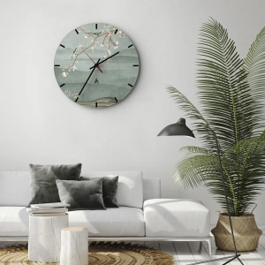 - Zegar ścienny z delikatnym motywem gałązki kwiatowej i ptaków, osadzony na tle zielonych, łagodnych wzgórz. Kompozycja pełna subtelności i harmonii wprowadza do wnętrza atmosferę wiosennego spokoju i naturalnego piękna.