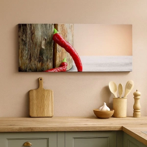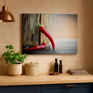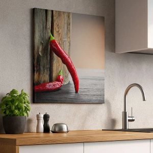 "Red hot chili peppers" to oryginalny obraz na płótnie przedstawiający dwie czerwone papryczki chili umieszczone na tle drewna o rustykalnym stylu. Intensywna czerwień papryczek kontrastuje z naturalnymi odcieniami drewna, nadając obrazowi wyrazistości i ciepłego charakteru. Motyw ten idealnie komponuje się z kuchnią lub jadalnią, dodając wnętrzom świeżości i energii.