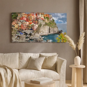 Obraz na płótnie - Kolorowe domy na klifie nad brzegiem morza w Cinque Terre - 120x80cm - Gromadka przytulona do skał - Nowoczesna dekoracja ścienna do salonu, kuchni i sypialni ARTTOR