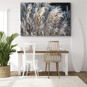 - Obraz na płótnie o wymiarach 70x50 cm przedstawiający zimowe źdźbła traw pokryte szronem na tle ciemnej zieleni. Dekoracja, która wprowadza do wnętrza subtelność i harmonię natury.